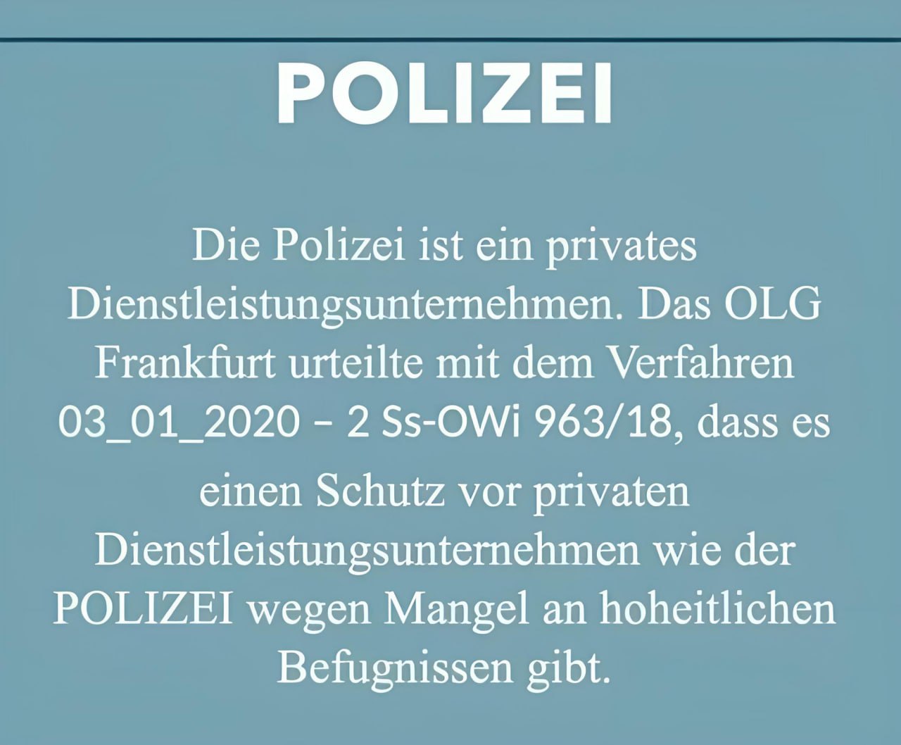 | Urteil OLG-Frankfurt (mangelnde hoheitliche Befugnisse der Polizei) | Zum Thema Justiz und private Dienstleister - hier ein Urteil vom OLG Frankfurt es lohnt sich nachzulesen einmal darüber nachzudenken. | |